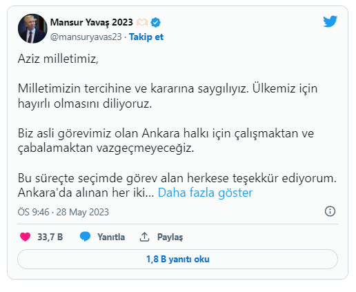 Bu süreçte seçimde görev alan herkese teşekkür ediyorum. Ankara'da alınan her iki turdaki sonuçta bizleri yalnız bırakmadıklarını gösteren Ankaralı hemşehrilerime canıgönülden teşekkürlerimi ve şükranlarımı sunuyorum."