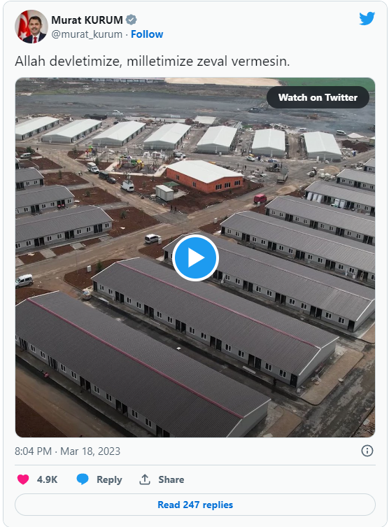 Bakan Kurum, sosyal medya hesabından "Allah devletimize, milletimize zeval vermesin." notuyla prefabrik evlere yerleşen depremzedelerin görüntülerini paylaştı.