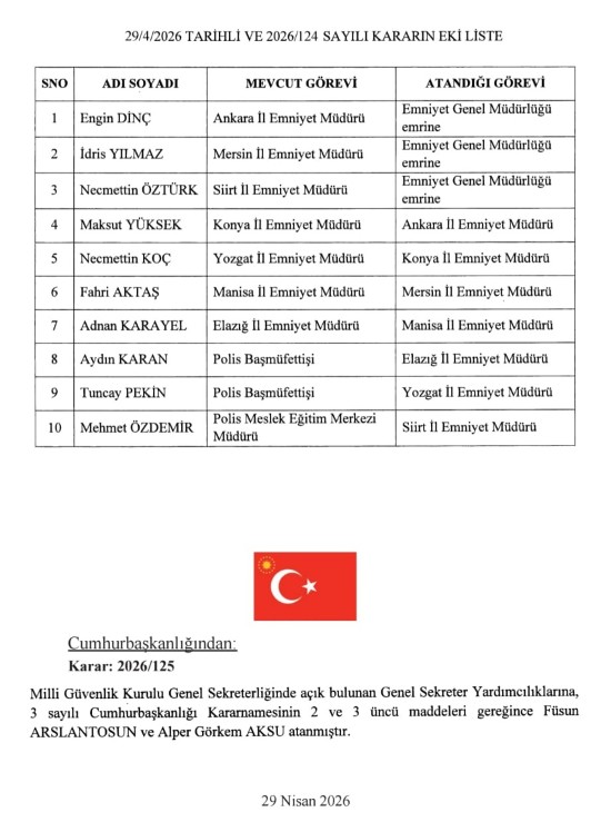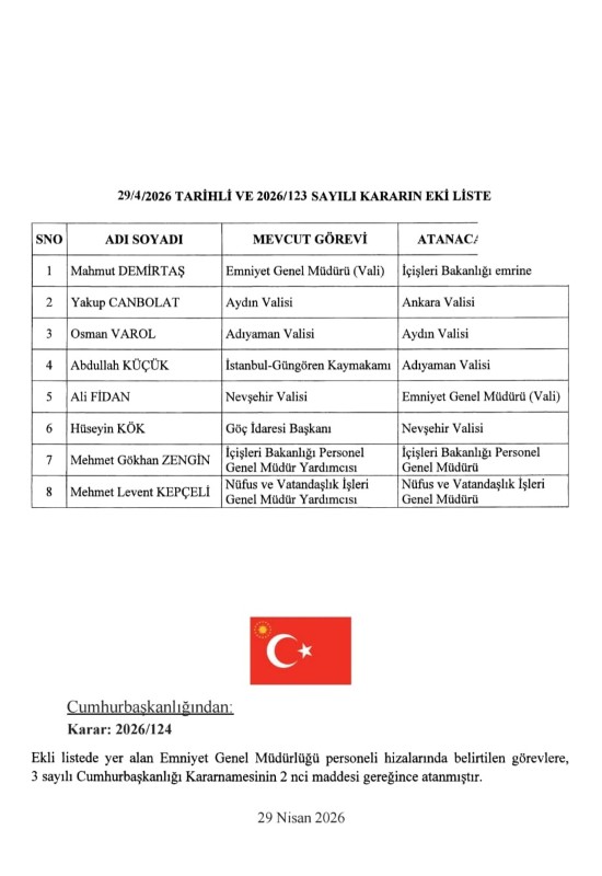 Ankara, Mersin, Siirt, Konya, Manisa, Yozgat, Elazığ Emniyet Müdürlüklerine atama yapılırken Emniyet Genel Müdürü Mahmut Demirtaş görevden alındı. Bu göreve Nevşehir Valisi Ali Fidan atandı.