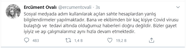 Ovalı, Twitter hesabında şu ifadeleri kullandı: "Sosyal medyada adım kullanılarak açılan sahte hesaplardan yanlış bilgilendirmeler yapılmaktadır. Bana ve ekibimden bir kaç kişiye Covid virusu bulaştığı ve tedavi altında olduğumuz haberleri doğru değildir. Bizler gayet iyiyiz ve aşı çalışmalarımız aynı hızla devam etmektedir."