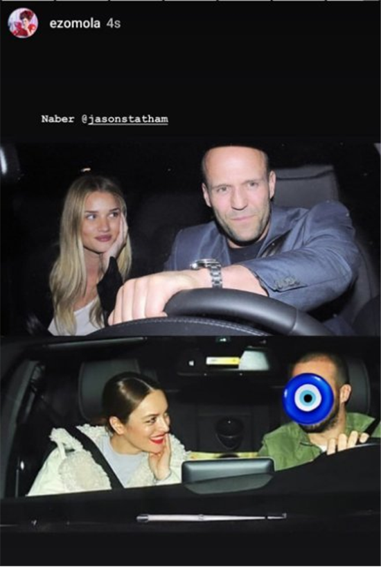 Bir süredir aşk yaşadığı Mustafa Aksakallı ile arabada çekilmiş bir karesini Jason Statham’ın benzer bir görüntüsü ile birleştiren Ezgi Mola, sevgilinin yüzünü nazar boncuğu ile kapatmayı tercih ederken bu fotoğrafın üzerine ‘Naber Jason Statham.’ notunu düştü.