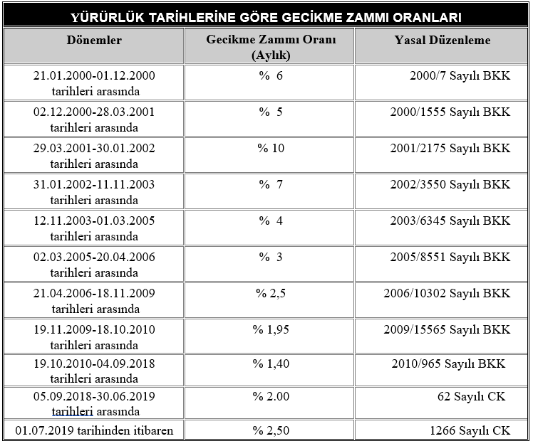 6183 sayılı Amme Alacaklarının Tahsil Usulü Hakkında Kanunun 51. Maddesinde yer alan ve aylık % 2 olarak uygulanmakta olan gecikme zammı oranı, 29.06.2019 tarihli ve 30816 sayılı Resmi Gazete’de yayımlanan 1266 Sayılı Cumhurbaşkanlığı Kararı ile 1 Temmuz 2019 tarihinden itibaren aylık % 2,5’e yükseltildi. % 2 oranı, 5 Eylül 2018 yılından bu yana uygulanıyordu.